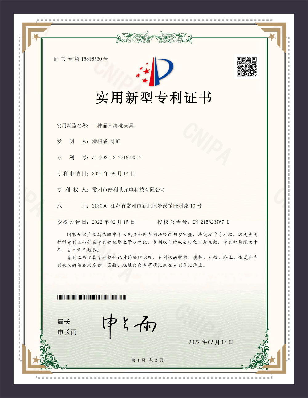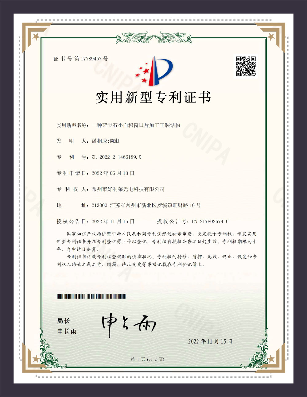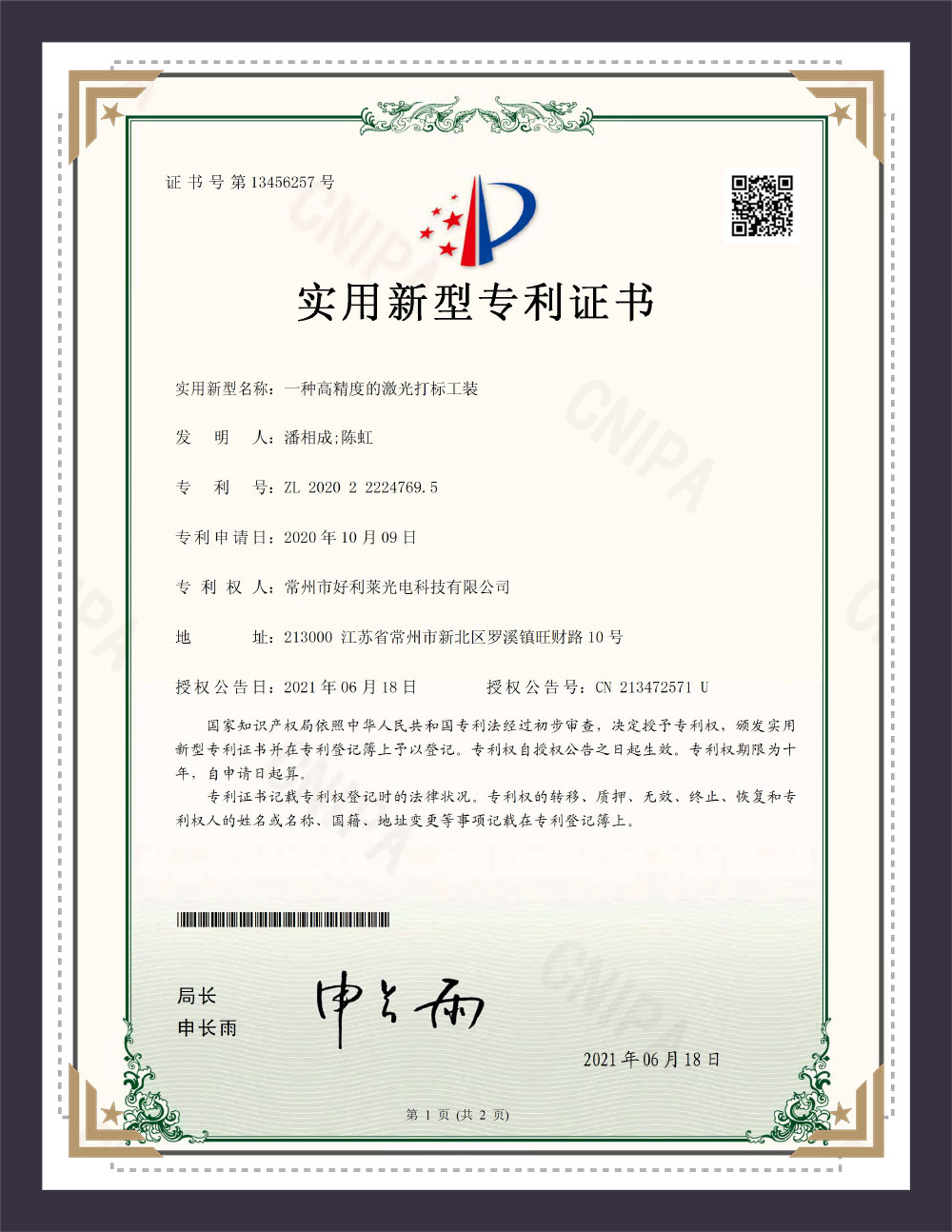 Certyfikat patentowy modelu użyteczności
